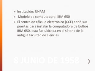 El documento resume los hitos más importantes en el desarrollo de la tecnología de la información y la computación en México entre 1958 y 2003, incluyendo la adquisición de las primeras computadoras IBM 650 y Bendix G en la UNAM en 1958 y 1960, respectivamente; México uniéndose al sistema satelital Intelsat en 1966; y el surgimiento de computadoras personales como la IBM PC Junior y Apple II en los años 1980 y el desarrollo de redes e infraestructura de telecomunicaciones en las décadas siguientes.
