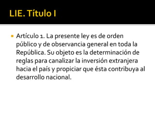 La ley de inversión extranjera de México regula la inversión foránea en el país. Designa sectores estratégicos como petróleo, electricidad y correos como reservados al Estado, y transporte terrestre y banca de desarrollo como reservados a mexicanos. Permite hasta 49% de capital extranjero en instituciones financieras y más del 49% con aprobación especial. Pemex invertirá 243 mil millones de pesos en 2011 en contratos para extraer petróleo y gas de 22 proyectos estratégicos,