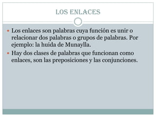 Este documento describe los diferentes tipos de enlaces en la gramática española. Explica que las preposiciones y las conjunciones son palabras que unen o relacionan otras palabras o grupos de palabras. Luego detalla que las preposiciones conectan dos palabras para complementar o explicar la relación entre ellas, mientras que las conjunciones unen ideas similares. Finalmente, enumera ejemplos comunes de preposiciones y conjunciones copulativas, disyuntivas y adversativas.