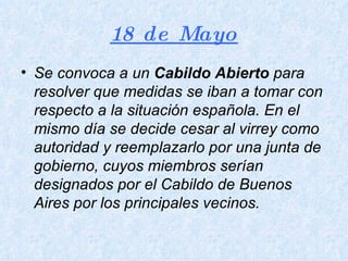 El documento resume los eventos clave de la Revolución de Mayo de 1810 en Buenos Aires que llevaron a la formación de la Primera Junta. El 18 de mayo se convocó a un cabildo abierto que decidió cesar al virrey y reemplazarlo por una junta de gobierno designada por el cabildo. El 22 de mayo otro cabildo abierto votó por cesar al virrey y delegar la formación de una nueva junta en el cabildo. El 25 de mayo, ante las protestas populares, el cabildo eliminó al virrey