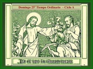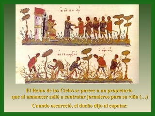 El documento analiza la parábola del Evangelio de Mateo sobre los obreros contratados para trabajar en la viña. Explica que todos los creyentes tienen un puesto importante en la Iglesia, aunque algunos no se sienten invitados a participar. También argumenta que el reino de Dios requiere el esfuerzo de todos los hombres y mujeres para construir un mundo más justo.