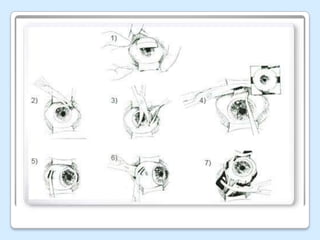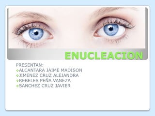 La enucleación es la extirpación del globo ocular y parte del nervio óptico, preservando los músculos y párpados. Se realiza para eliminar dolores intensos causados por enfermedades como glaucoma, infecciones u otras afecciones, o para mejorar la apariencia en casos de malformaciones. El procedimiento implica disecar la conjuntiva, cortar los músculos rectos que mueven el ojo y retirar el globo ocular, reemplazando el volumen con un implante. Luego se coloca una prótesis similar al