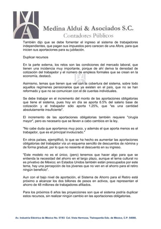 El presidente de la Consar alertó que se requiere aumentar las aportaciones al sistema de pensiones, ya que los trabajadores mexicanos aportan muy poco a sus cuentas individuales de Afore. Actualmente, los trabajadores sólo aportan 1.25% de su salario a las Afore, lo cual es insuficiente. Se necesita realizar cambios en la ley para incrementar tanto las aportaciones obligatorias de los trabajadores como las aportaciones voluntarias a fin de mejorar las tasas de reemplazo al retiro. De no aumentar las aportaciones