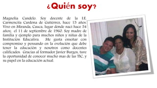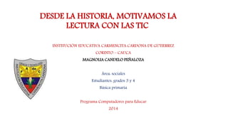Este documento describe un proyecto pedagógico que utiliza las TIC para motivar la lectura y el aprendizaje de la historia y cultura Nasa entre estudiantes de tercero y cuarto grado. El proyecto busca que los estudiantes comprendan la importancia de conocer la historia de sus antepasados a través de material didáctico e interactivo creado con las TIC. Los resultados mostraron que las actividades motivaron a los estudiantes y despertaron su interés en la cultura Nasa.