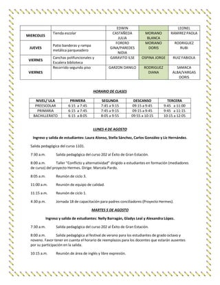 Este documento presenta el plan de actividades y horarios para la semana del 4 al 8 de agosto en el Colegio María Mercedes Carranza. Incluye los turnos asignados a los docentes para acompañar el ingreso, descanso y salida de los estudiantes, así como reuniones, salidas pedagógicas y el horario de clases. También contiene información general sobre el nacimiento de un hijo de un docente, cambios en el horario de algunos cursos y recomendaciones sobre el servicio de alimentación escolar.