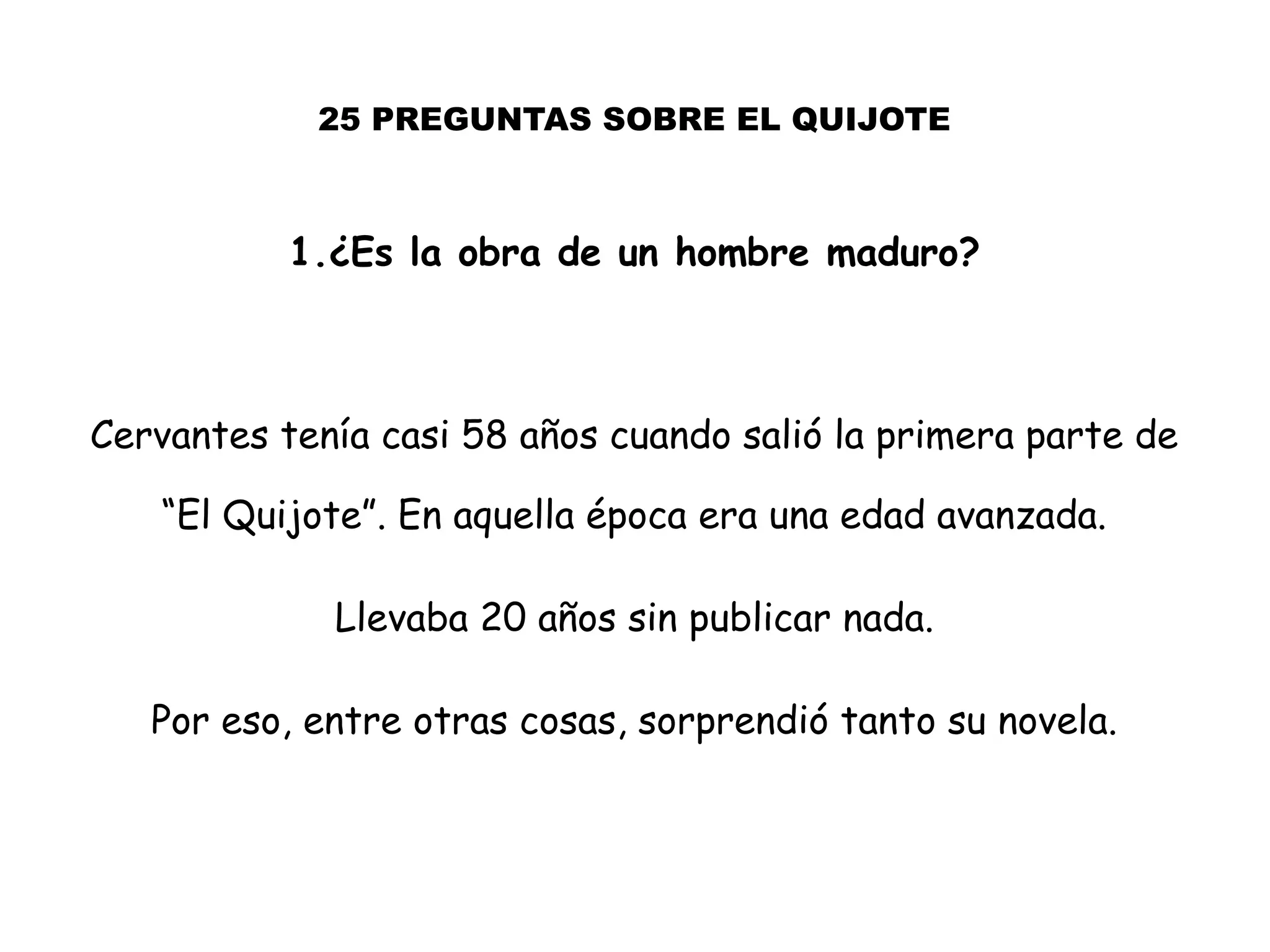 El documento presenta una serie de preguntas y respuestas sobre 'Don Quijote de la Mancha', explorando aspectos de la vida de Cervantes, la obra y sus personajes. Destaca la dualidad entre Don Quijote y Sancho Panza, la crítica a la realidad a través del humor y la relevancia de la obra como símbolo de España y primera novela moderna. Además, se discuten temas como el éxito editorial de la novela y su impacto cultural.
