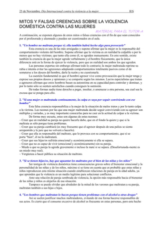 Este documento propone actividades para las tutorías de un instituto sobre mitos y falsas creencias sobre la violencia contra las mujeres. El objetivo es concienciar a los estudiantes sobre esta problemática cuestionando creencias erróneas. Se presentan 15 mitos comunes como que la mujer provoca la violencia o que es un asunto privado. Se propone un cuestionario inicial, lectura de cada mito, debate y registro de conclusiones para desmontar estas falsas creencias.