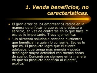 Este documento presenta 25 secretos de ventas compartidos por 5 expertos en el tema. Algunos de los secretos clave son: 1) enfocarse en los beneficios del producto para el cliente en lugar de sus características, 2) vender a clientes potenciales más propensos a comprar, y 3) distinguir el producto ofreciendo 3 razones para que el cliente lo pruebe. Otros consejos incluyen realizar ventas cara a cara, escuchar activamente al cliente, y ofrecer garantías de satisfacción.