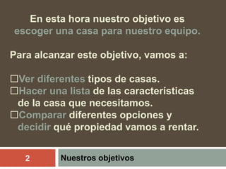 Este documento describe la casa de María José Suárez en Navarre, Florida. Incluye fotos de diferentes partes de su casa como la entrada principal, la sala, la cocina, el comedor, la habitación principal, el baño principal y la lavandería. También menciona que tiene un estudio, un cuarto de invitados y un cuarto para su perrita. El documento luego proporciona instrucciones sobre cómo describir una casa usando palabras como "tiene", "hay", y adjetivos posesivos como "mi" y "su". Finalmente, discute las característic