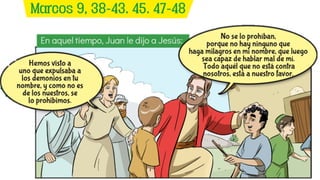 El documento presenta el evangelio del domingo XXVI del Tiempo Ordinario (ciclo B) de la misa. Jesús enseña a sus discípulos a no marginar a nadie y a ser inclusivos, porque aquellos que ayudan a otros aunque sea con un vaso de agua recibirán una recompensa. También les advierte sobre los peligros de escandalizar a otros o inducirlos al pecado.