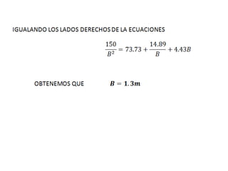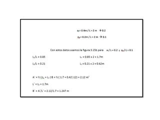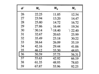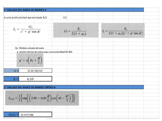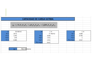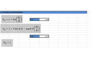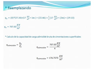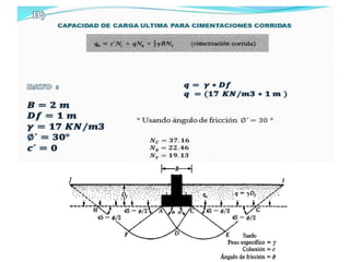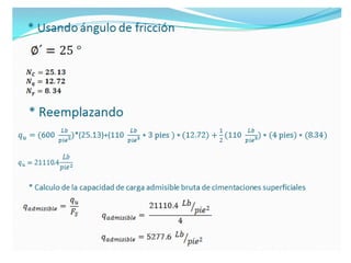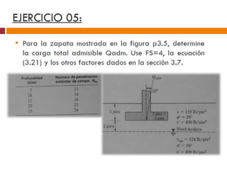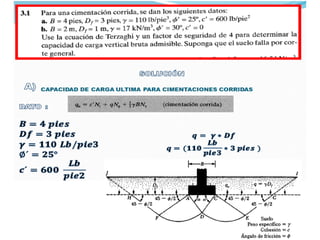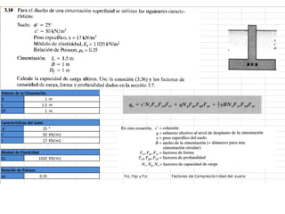 El documento presenta varios ejercicios de diseño de cimientos. El Ejercicio 1 describe el marco teórico utilizando la Tabla 3.1 de Terzaghi para determinar factores de capacidad de carga. El Ejercicio 2 resuelve un problema de diseño de zapata usando la ecuación general de Terzaghi. El Ejercicio 3 resuelve dos problemas de diseño de cimientos corridos usando la ecuación general y factores.