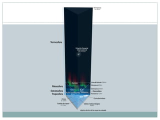 Este documento describe la atmósfera terrestre, incluyendo su composición, las capas principales y su importancia para los seres vivos. Explica que la atmósfera está compuesta principalmente por nitrógeno, oxígeno y vapor de agua. Se divide en troposfera, estratosfera, mesosfera e ionosfera. También analiza los principales contaminantes atmosféricos como el monóxido de carbono, dióxido de carbono y ozono, así como sus efectos en la salud y el medio ambiente.