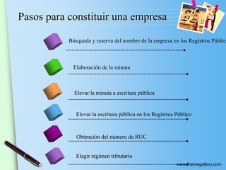 El documento describe los pasos para constituir una empresa en Perú, incluyendo la búsqueda del nombre de la empresa, elaboración de la minuta, elevar la minuta a escritura pública, registrar la escritura, obtener el número RUC, elegir el régimen tributario, legalizar libros, planillas y afiliar trabajadores a la seguridad social, y solicitar la licencia municipal.