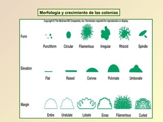 El documento describe la morfología de las colonias bacterianas, incluyendo su forma (puntiforme, circular, filamentosa, etc.), elevación (plana, convexa, etc.), y margen (entero, ondulado, etc.). También discute cómo el tamaño, forma, textura y color de una colonia varían entre especies bacterianas y pueden cambiar dependiendo del medio de cultivo. Finalmente, explica técnicas comunes en microbiología como la fijación y tinción de células, y la transferencia aséptica para evitar la contamin