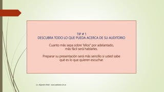 El documento proporciona 25 consejos para hacer presentaciones orales efectivas. Algunos de los consejos clave incluyen conocer al público objetivo, desarrollar un mensaje claro, practicar la presentación a conciencia y usar historias, preguntas y objetos para involucrar a la audiencia. El objetivo general es entregar información de manera simple y entretenida para impactar al público.