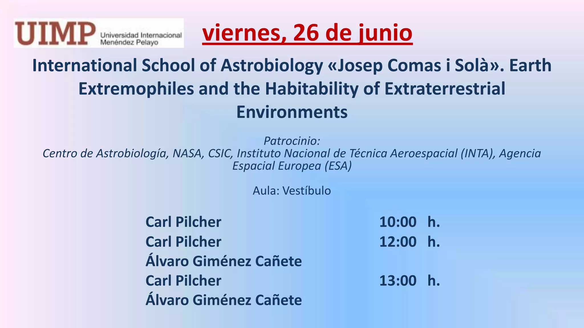 El documento proporciona la agenda de varios eventos que tendrán lugar el viernes 26 de junio en la International School of Astrobiology «Josep Comas i Solà». Los eventos cubren una variedad de temas como astrobiología, evolución, transición a la democracia en España, transparencia institucional, comunicaciones por satélite y nuevos retos en endoscopia digestiva. Cada evento incluye los nombres, horarios y lugares de las charlas y conferencias programadas para ese día.