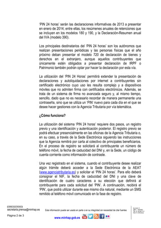 El gobierno español ha implementado un nuevo sistema llamado "PIN 24 horas" que permite a los autónomos y personas físicas presentar declaraciones e impuestos ante la Agencia Tributaria a través de Internet sin necesidad de un certificado digital. El sistema funciona mediante la solicitud de un código PIN por SMS que es válido por 24 horas y permite realizar trámites en línea de forma segura y sencilla.