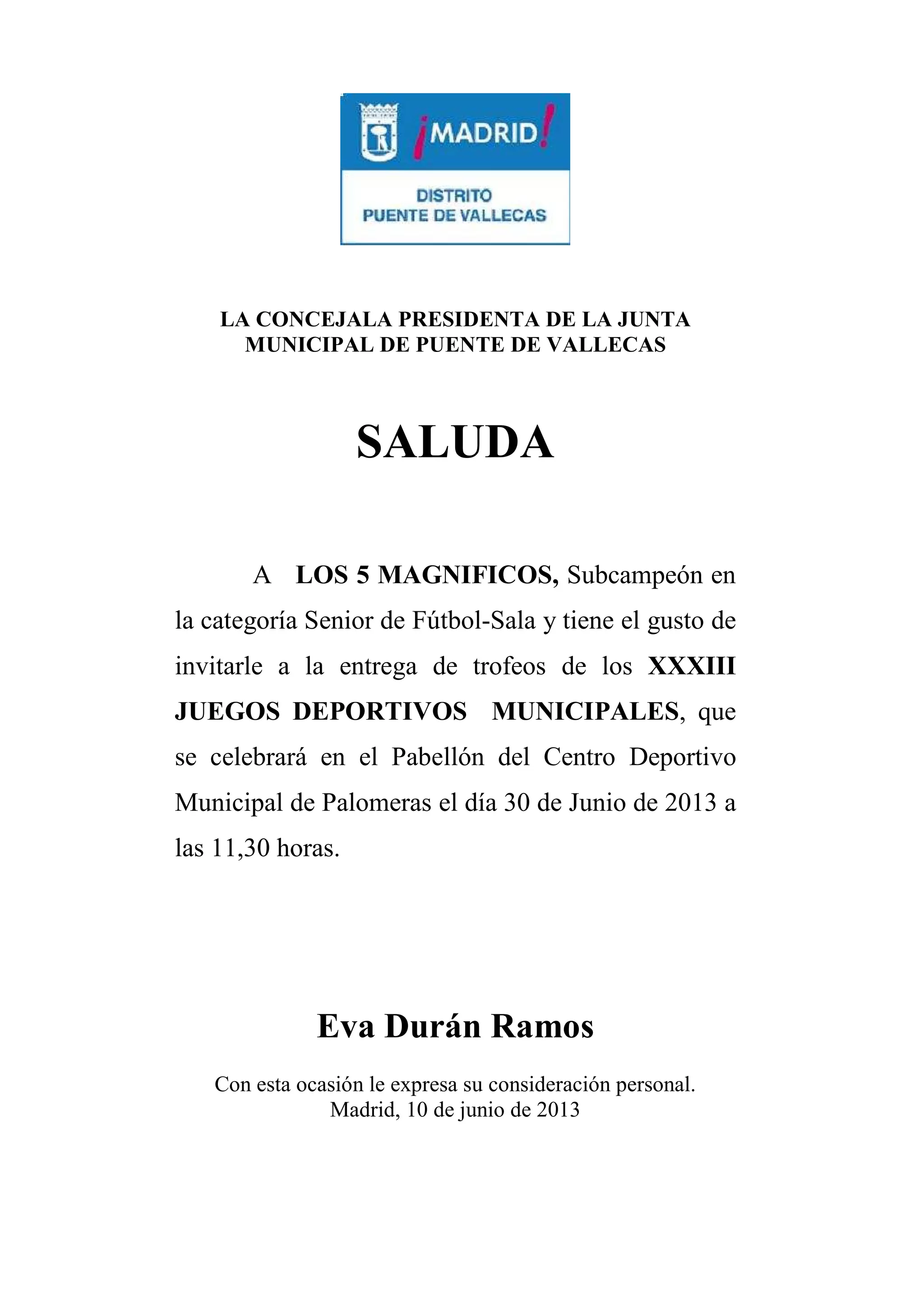 La concejala presidenta de la Junta Municipal de Puente de Vallecas invita a Los 5 Magníficos, el subcampeón en la categoría Senior de Fútbol-Sala, a la entrega de trofeos de los XXXIII Juegos Deportivos Municipales que se celebrará el 30 de junio de 2013 a las 11:30 horas en el Pabellón del Centro Deportivo Municipal de Palomeras. La concejala expresa su consideración personal hacia Los 5 Magníficos con esta invitación.