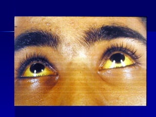 El documento proporciona información sobre ictericia, incluyendo su definición, clasificación y causas. La ictericia se define como una coloración amarillenta de la piel, mucosas y escleróticas causada por niveles elevados de bilirrubina. Se clasifica en pre-hepática, hepática, y post-hepática. La ictericia pre-hepática se debe a hemolisis o eritropoyesis defectuosa. La ictericia hepática puede deberse a enfermedades hepáticas como hepatitis o cirrosis. La ictericia post-hepática