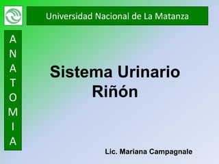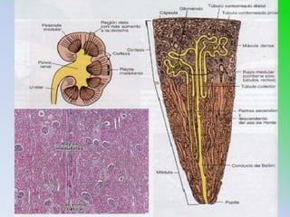 El documento proporciona información sobre el sistema urinario, con un enfoque en el riñón. Describe las funciones del riñón, incluida la filtración, reabsorción, excreción y regulación. Explica las partes del riñón, incluidas la corteza, médula, pirámide de Malpighi y columna de Bertin. También describe la nefrona como la unidad funcional del riñón, incluidos el corpúsculo renal, el sistema tubular y sus componentes.