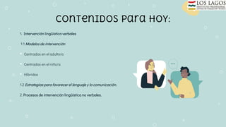 Este documento presenta diferentes modelos de intervención lingüística para personas con autismo. Describe tres modelos: 1) centrado en el niño, que se enfoca en contextos naturales y el desarrollo del niño; 2) centrado en el adulto, que es más estructurado con objetivos definidos; y 3) híbrido, que combina elementos de los dos anteriores. También explica estrategias como la simplificación y el modelado para favorecer el lenguaje, así como sistemas de comunicación aumentativos para quienes no se comunican oralmente