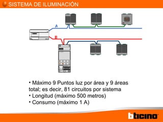 El documento describe una interfaz entre sistemas de iluminación que permite la expansión física y lógica de los sistemas, así como la integración con sistemas de alarma y de control digital. La interfaz expande la capacidad del sistema más allá de 81 circuitos o 500 metros, y permite vincular los sistemas de iluminación con alarmas y automatización de viviendas.