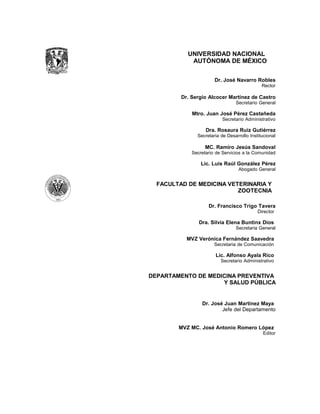 Este documento presenta un manual de prácticas de medicina preventiva y salud pública de la Facultad de Medicina Veterinaria y Zootecnia de la UNAM. Incluye secciones sobre diagnóstico de situación en salud, educación para la salud y planificación en programas de salud pública veterinaria. El manual provee una guía metodológica para realizar diagnósticos de situación, impartir educación para la salud y desarrollar programas de salud pública veterinaria.