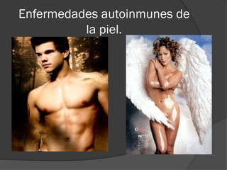 Este documento describe varias enfermedades autoinmunes de la piel como el pénfigo, dermatitis herpetiforme, psoriasis, vasculitis, lupus eritematoso sistémico y eritema multiforme. Explica las características generales de la piel y los mecanismos inmunológicos involucrados en estas enfermedades como la activación de linfocitos T, citoquinas e interacciones antígeno-anticuerpo. También cubre el tratamiento de algunas de estas afecciones como la fototerap