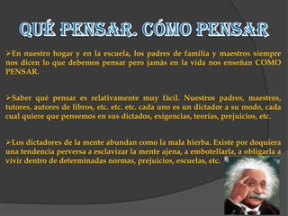 Este documento discute la importancia de enseñar a las personas cómo pensar en lugar de decirles qué pensar. Argumenta que los padres, maestros y otros dictan sus propias opiniones pero rara vez enseñan a las personas a analizar y comprender por sí mismas. En cambio de dictar ideas, los maestros deberían enseñar a los estudiantes a usar su mente de manera libre y creativa para que puedan experimentar la verdad por sí mismos.