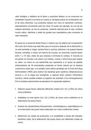 El documento trata sobre la elaboración de queso fresco utilizando nisina como antibiótico. Explica que los productos lácteos como el queso son ricos en nutrientes pero también pueden contener bacterias patógenas. La nisina es un antibiótico permitido que puede usarse para reducir dichas bacterias y aumentar la vida útil del queso fresco. Luego resume el proceso de elaboración de queso fresco y los objetivos del estudio de utilizar diferentes niveles de nisina para optimizar sus características.