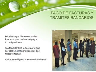 Sanmarexpress ofrece servicios de pago de facturas y trámites bancarios por $5.000, afiliaciones y novedades en EPS por $15.000, y entrega de resultados de exámenes en Medellín por $15.000 o en el resto del valle de Aburrá por $20.000, para ayudar a los clientes a evitar largas filas y trámites en entidades bancarias y de salud.