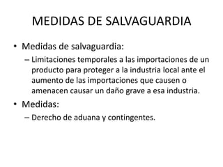 Este documento describe medidas de salvaguardia para proteger a la industria local ante aumentos de importaciones que causen daño. Explica que las medidas de salvaguardia incluyen limitaciones temporales a las importaciones a través de derechos de aduana o contingentes. También resume que el Acuerdo General sobre Aranceles Aduaneros y Comercio (GATT) permite a un país suspender o modificar sus obligaciones comerciales de manera temporal si las importaciones aumentan de forma imprevista y amenazan causar daño grave a la industria nacional.