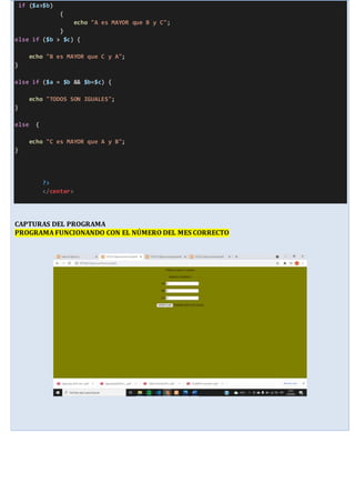 Este documento presenta un informe de una práctica realizada sobre operadores lógicos en PHP. El objetivo fue mejorar el uso de lenguaje PHP y variables, y aprender sobre este nuevo lenguaje. Las actividades incluyeron crear un ejercicio en PHP para ingresar números y verificar cuál es mayor usando operadores lógicos como && y ||. Los resultados mostraron una mejor comprensión de PHP y el uso de servidores como XAMPP.