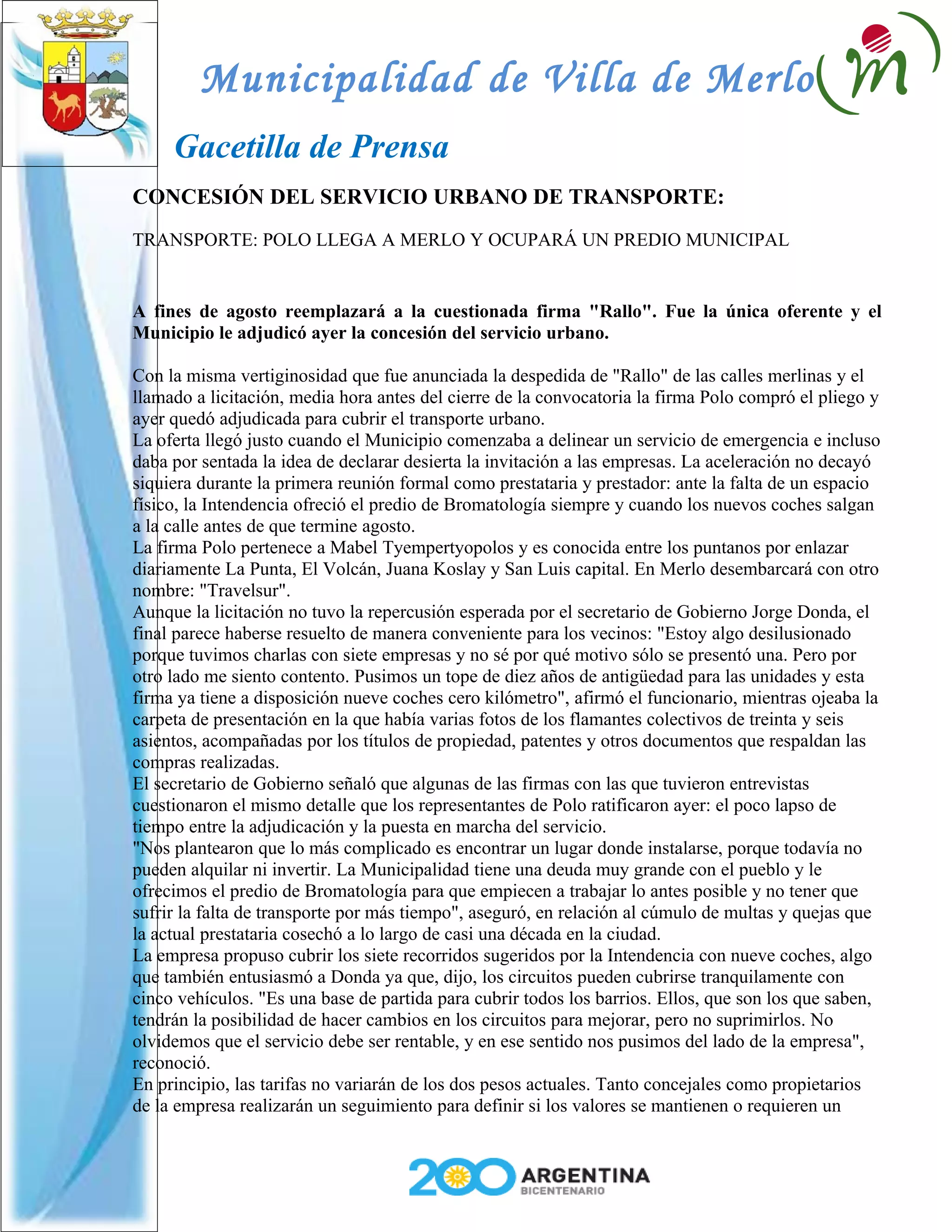 La Municipalidad de Villa de Merlo adjudicó a la empresa Polo el servicio urbano de transporte, reemplazando a la firma Rallo. Polo fue la única oferente y pondrá 9 unidades cero kilómetro. El secretario de Gobierno está contento con la adjudicación a pesar de solo haber recibido una oferta, y la empresa usará un predio municipal de forma provisoria.