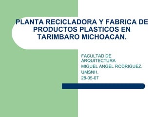 La planta recicladora y fábrica de productos plásticos en Tarímbaro, Michoacán contribuirá a disminuir la contaminación de Morelia al reciclar plásticos y generar empleos. El proyecto es viable debido al creciente problema mundial de contaminación causado por factores como la globalización y la industria de alimentos enlatados. La planta necesitará zonas administrativas, de servicios, una nave industrial, áreas verdes, estacionamiento y patio de maniobras.
