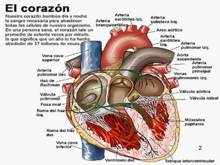 El documento describe el sistema circulatorio y sus componentes principales. Explica que el corazón bombea la sangre a través de las arterias, que transportan la sangre oxigenada desde el corazón. La sangre pasa a los capilares donde ocurre el intercambio de oxígeno y nutrientes con los tejidos antes de regresar a través de las venas al corazón. El sistema circulatorio transporta oxígeno y nutrientes a las células y recoge desechos para su eliminación.