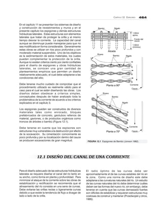 Este documento describe diferentes estructuras utilizadas para la estabilización de riberas, incluyendo espigones cortos, espigones largos y diques longitudinales. Explica que los espigones son estructuras que desvían la corriente para prevenir la erosión de orillas y establecer un cauce más estable. También describe los diferentes tipos de materiales con los que se pueden construir espigones, así como su diseño y forma.
