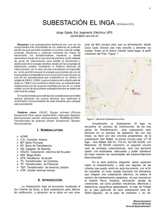 Este documento describe la subestación eléctrica El Inga en Ecuador. La subestación permitirá evacuar la energía del proyecto Coca Codo Sinclair y alimentará sistemas en Quito y Guayaquil. Contendrá tres patios de transformación a 500 kV, 230 kV y 138 kV. El mantenimiento incluye revisiones, limpiezas y pruebas de los transformadores, interruptores, seccionadores y otros equipos para garantizar su correcto funcionamiento.