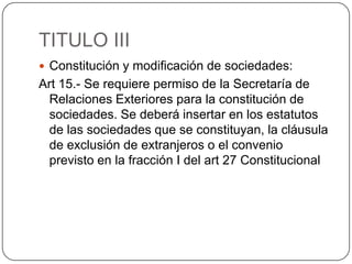 El documento habla sobre los requisitos legales para que compañías extranjeras operen en México. Se requiere permiso del gobierno mexicano para establecer una compañía, cambiar su nombre o razón social. También se necesita autorización para que compañías extranjeras realicen comercio regular en México o establezcan una presencia física. La autorización se otorga si la compañía cumple con las leyes de su país de origen, sus documentos no van en contra de las leyes mexicanas y tiene representación en Mé