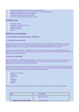 Este documento describe el profesor eficaz y los modelos de enseñanza. Define los roles del profesor como experto en instrucción, motivador, organizador, líder y orientador. Describe las relaciones del profesor con los alumnos, otros profesores y su formación continua. Analiza tres modelos de enseñanza: uno centrado en los contenidos, otro en los efectos y otro en el proceso de aprendizaje.