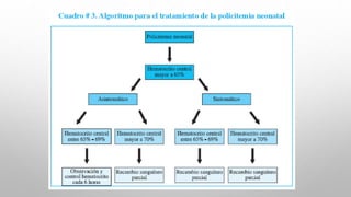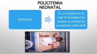 La policitemia neonatal es un aumento anormal de glóbulos rojos en recién nacidos, definido como un hematocrito venoso o arterial mayor a 65%. Puede ser causado por demora en el pinzamiento del cordón umbilical, diabetes materna, problemas genéticos u otras condiciones. Esto puede inducir hiperviscosidad sanguínea, reduciendo el flujo circulatorio y potencialmente causando trombosis. Los síntomas pueden incluir somnolencia, dificultades alimentarias y convulsiones. El diagnóstico se realiza midiendo
