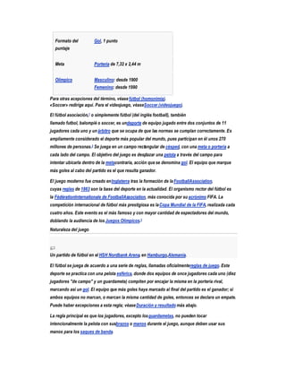 El documento describe las características fundamentales del fútbol. Se juega entre dos equipos de 11 jugadores cada uno, con el objetivo de marcar goles introduciendo el balón en la portería contraria. La FIFA es la autoridad rectora del deporte a nivel mundial y se juega principalmente en canchas de césped rectangular de 90x45 metros.