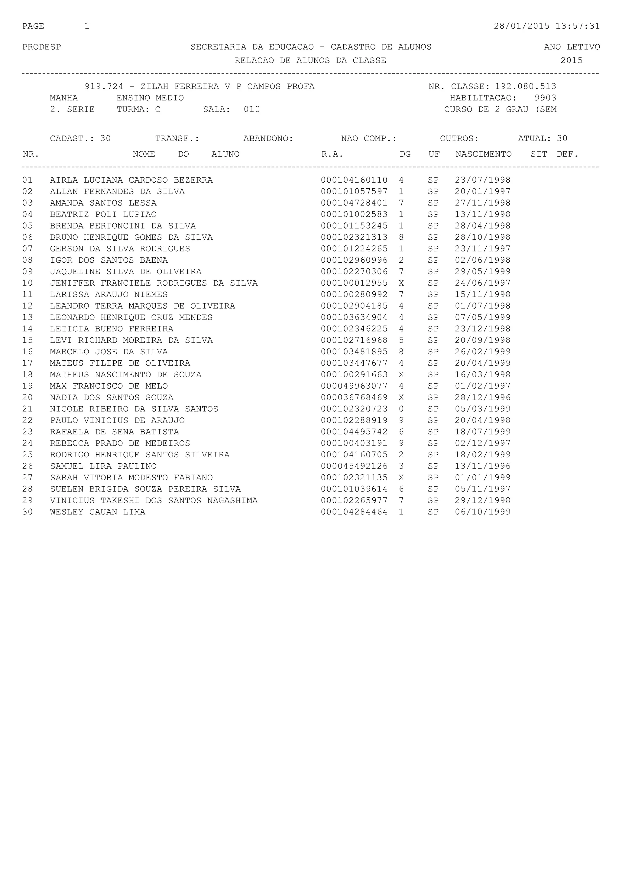 Este documento contiene una lista de 30 estudiantes de una clase en el segundo grado de la escuela secundaria. Incluye el nombre, número de registro, fecha y lugar de nacimiento de cada estudiante.