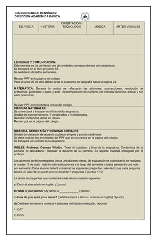 Este informativo semanal para el segundo año básico "B" del Colegio Camilo Henríquez detalla los requerimientos y evaluaciones para la próxima semana. Incluye información sobre las asignaturas de Lenguaje, Matemáticas, Ciencias Naturales, Historia e Inglés, así como los horarios de los profesores. También indica las pruebas y evaluaciones que se realizarán durante la semana del 6 al 10 de abril.