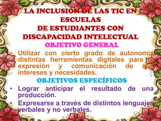 Este documento describe un proyecto para incluir las TIC en las escuelas de estudiantes con discapacidad intelectual en la Universidad Técnica de Cotopaxi. El objetivo general es que los estudiantes puedan utilizar herramientas digitales de forma autónoma para expresarse y comunicarse. Los objetivos específicos son lograr anticipar resultados de producciones y expresarse a través de lenguajes verbales y no verbales. El documento también señala que el grado de discapacidad de una persona depende de sus dificultades y las barreras o