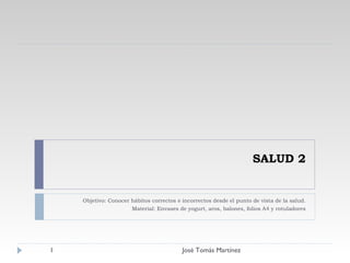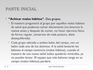 Este documento presenta una serie de actividades para enseñar a los estudiantes sobre hábitos saludables e insalubres. Las actividades incluyen dividir a los estudiantes en grupos para discutir hábitos positivos y negativos, juegos con balones y aros que representan la adopción y eliminación de hábitos, y ejercicios para clasificar y discutir hábitos dañinos como el alcoholismo, el tabaquismo y el sedentarismo. El documento también cubre la postura correcta y el levantamiento de objetos pes