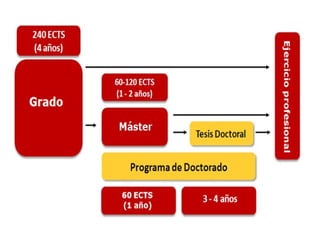 Este documento resume los principales aspectos del sistema educativo universitario español y el proceso de acceso a la universidad (PAU) para estudiantes que finalizan el bachillerato. Explica la estructura de los grados universitarios en términos de créditos ECTS, así como las normas de permanencia. Además, detalla las diferentes fases y materias de la PAU, y cómo se calcula la nota de acceso y de admisión para acceder a los grados universitarios.