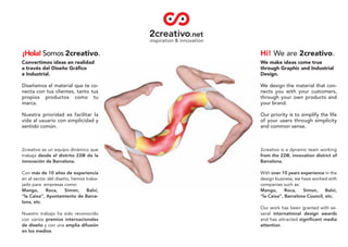 Este documento presenta a 2creativo, un estudio de diseño de Barcelona que se especializa en convertir ideas en realidad a través del diseño gráfico e industrial. El estudio ha trabajado para empresas importantes y ha ganado varios premios de diseño internacional. 2creativo se describe a sí mismo como un equipo dinámico y flexible que combina estrategia y diseño para mejorar ideas y llevarlas del buen nivel al excelente.