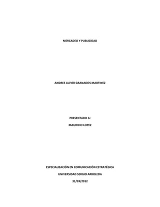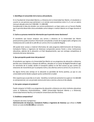 Este documento proporciona información sobre el mercado objetivo y el proceso de toma de decisiones de un estudiante potencial de la Universidad San Martín. El estudiante típico pertenece a los estratos socioeconómicos 2-3, de 22 a 42 años, que busca estudiar de forma semipresencial debido a otros compromisos como el trabajo o el hogar. El documento compara los programas y precios de la Universidad San Martín con otras instituciones y concluye que la ubicación céntrica y los bajos costos hacen