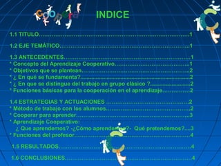 Este documento presenta el aprendizaje cooperativo como una estrategia educativa que permite a los estudiantes aprender unos de otros mediante el trabajo en grupos. Describe los objetivos, fundamentos y beneficios del aprendizaje cooperativo, así como las etapas del proceso y los roles del profesor y los estudiantes. El resumen concluye que esta estrategia fomenta la motivación, la implicación y la comprensión a través de la interacción entre iguales.